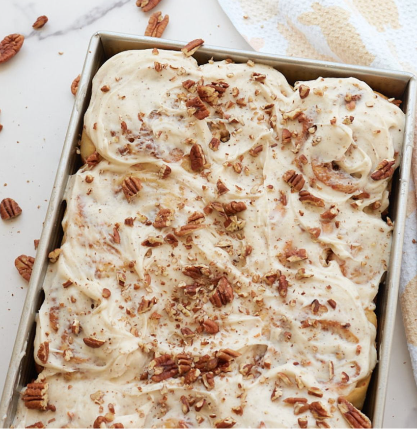 Een smeuige cinnamon roll – carrotcake style – met pecanoten in de vulling